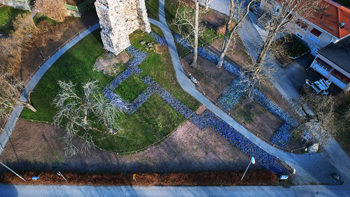 Av S:t Lars kyrka syns idag bara delar av ett tidigare kraftigt västtorn. Snart återuppstår den 900 år gamla kyrkan igen när tiotusentals himmelsblå vårstjärnor slår ut i blom och gestaltar kyrkans ursprungliga planform.